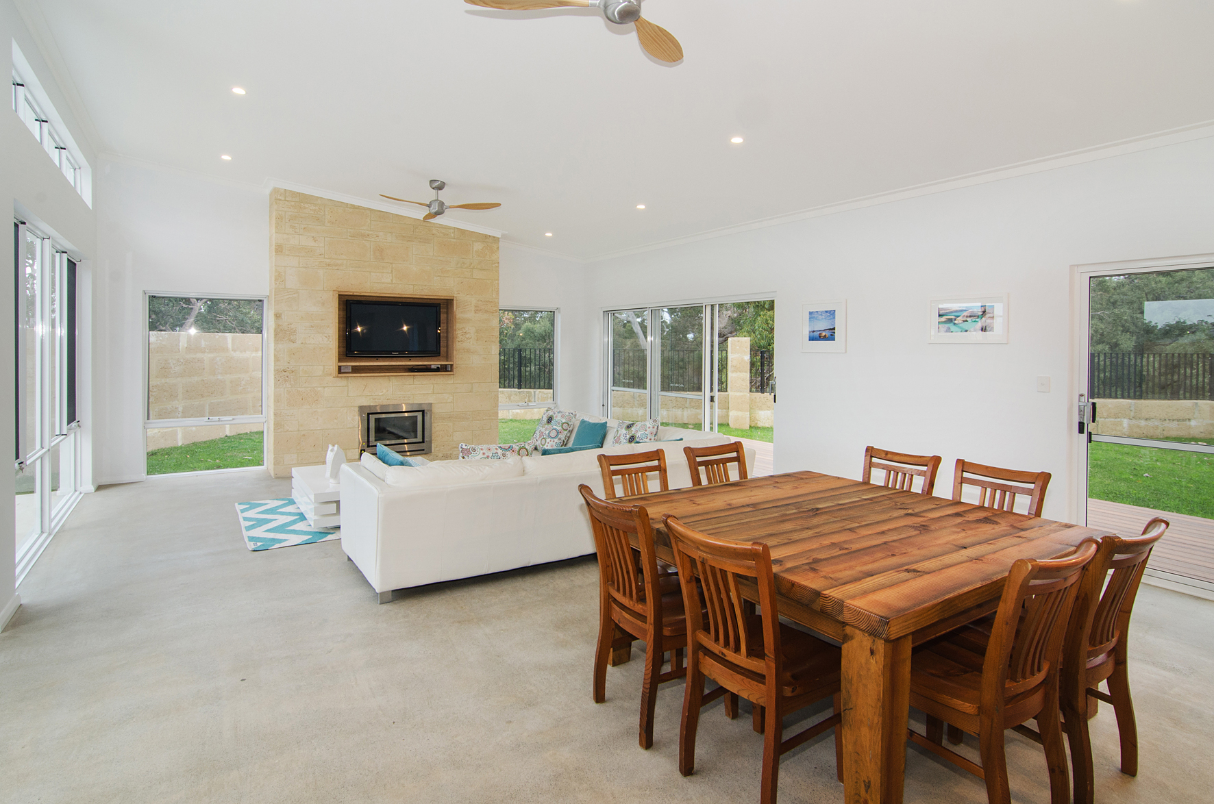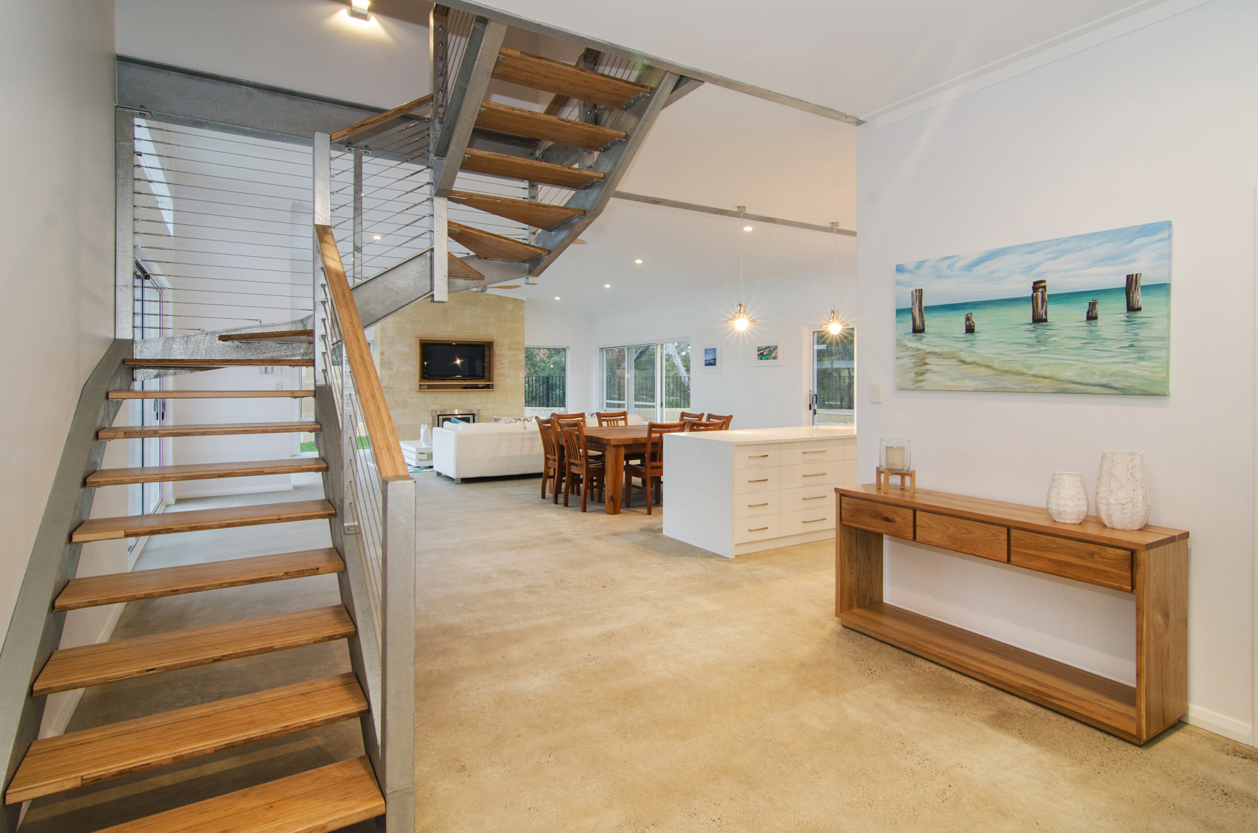 With galvanised steel and honed concrete inside, the stripped back industrial feel incorporates well with the clean and modern whites used throughout. The random limestone feature that surrounds the fireplace and TV brings some wonderful earthy tones inside to break up the raw steel and concrete.