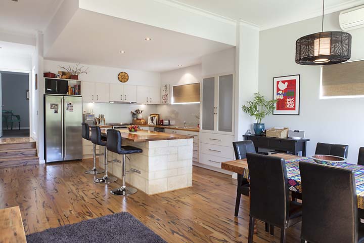 The use of Marri flooring and benchtops throughout also kept a sense of flow throughout the home.